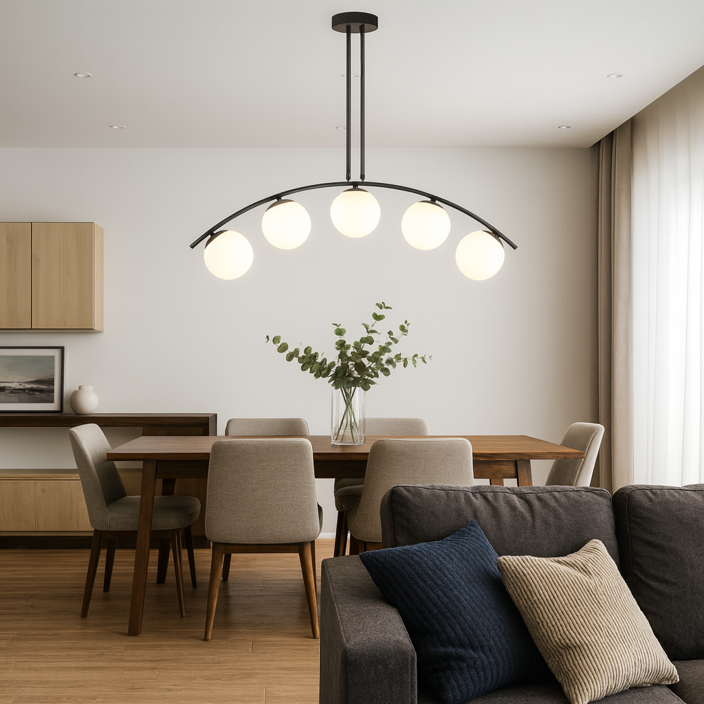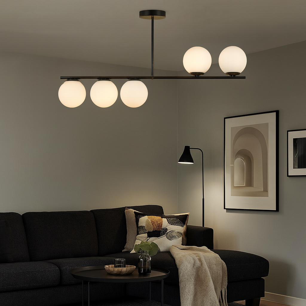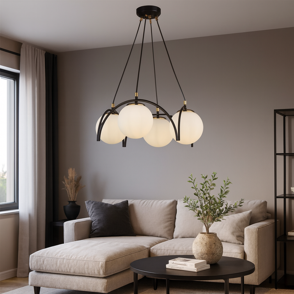Black chandelier with 5 white globes - modern design and uniform light This 5-bulb white...