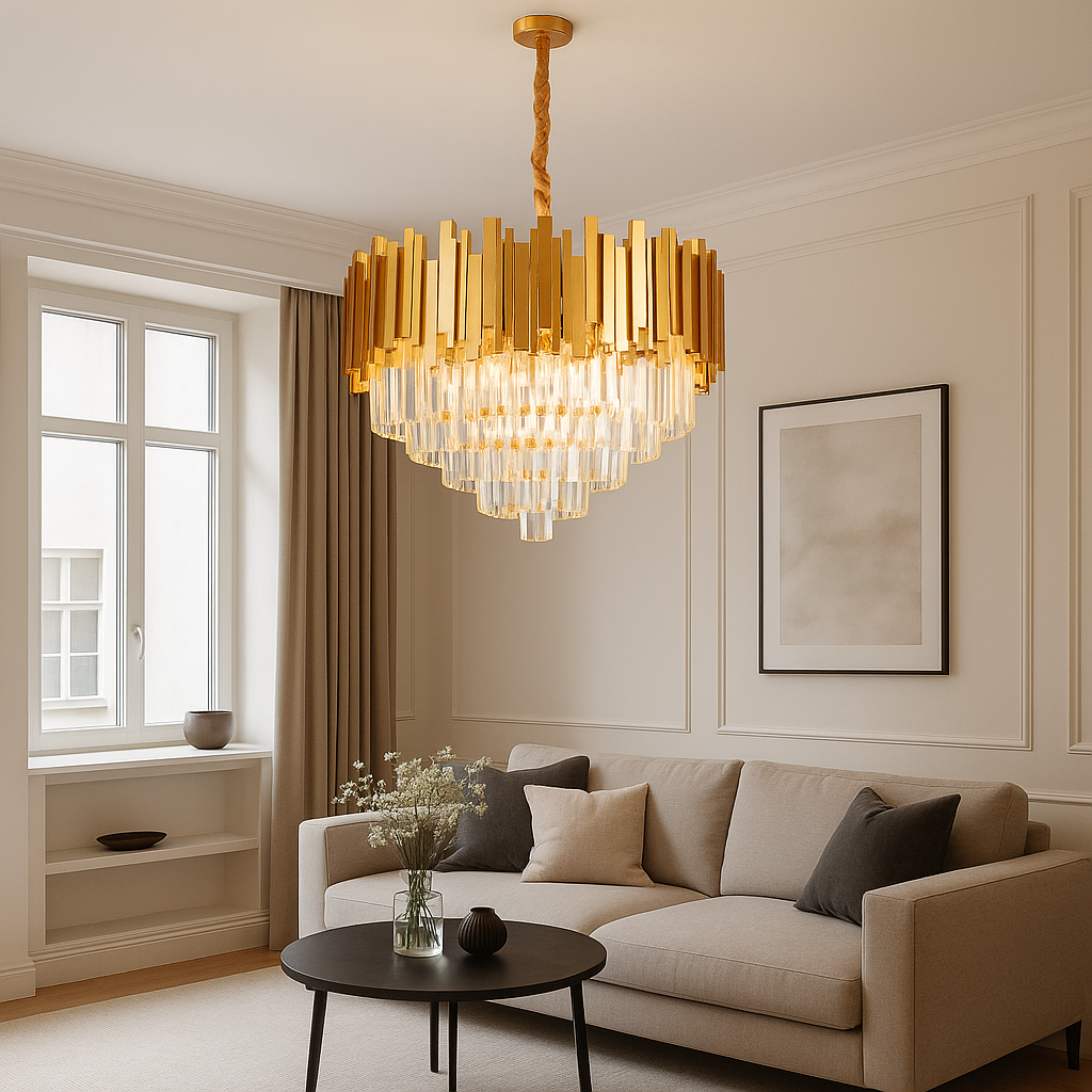 Transforma orice cameră intr-un spatiu elegant cu acest candelabru cu cristale si detalii aurii. Designul sau in trepte creeaza un joc spectaculos de lumina, adaugand profunzime si rafinament decorului. Este piesa de rezistenta perfecta pentru interioare moderne sau clasice, unde vrei un efect vizual impresionant si o atmosfera calda.