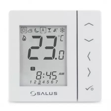 Termostatul Salus VS30W este un echipament dedicat pentru sistemele de incalzire in pardoseala sau radiatoare, acesta fiind conectat prin fir la un centrul de comanda KL08NSB (cumparat separat) sau la un servomotor, in functie de aplicatie. Acesta dispune de un design elegant, display mare LCD, se poate monta in doza electrica, este programabil, oferind posibilitatea setarii unor programe in timpul unei zile cat si in timpul unei saptamani si este prevazut cu butoane tactile pentru a modifica temperatura conform nevoilor dumneavoastra.