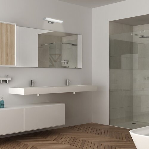 Lampa de perete pentru baie Evron in stil modern este o alegere excelenta pentru baia Dvs. daca aveti nevoie de un corp de iluminat suplimentar deasupra chiuvetei, langa oglinda. Corpul de metal cromat este complimentat de un abajur de plastic transparent. Lampa are incorporat un bec LED cu o putere de 7,5W, o intensitate luminoasa de 600 de lumenisi o durata de viata de 25.000 de ore. Sursa luminoasa de care economiseste multa energie, are o temperatura a culorii de 4000Ksi, in consecinta, straluceste cu o lumina alb cald. Evron are protectie IP44 care garanteaza ca este protejata impotriva intruziunii obiectelor cu diametrul de pana la 1 mmsi impotriva stropirii cu apa din orice directie. Dimensiunile acestei lampi de perete pentru baie sunt dupa cum urmeaza: lungime 500mm, inaltime 60mm, distanta de la perete 130mm, diametrul instalatiei de 120mm. Oferim o garantie de 5 ani pentru acest model.